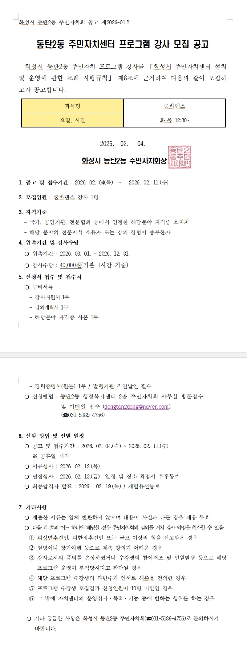 2026년 동탄2동 주민자치센터 강사 모집 공고 c
